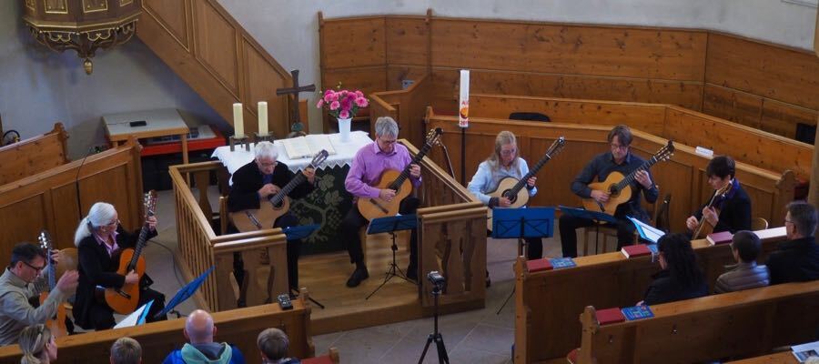 Die Liste der Komponisten reicht zeitlich von Guillaume de Machaut bis Claude Debussy, stilistisch vom Barock bis zu brasilianischem Chôro, nichts ist sicher. Auf diese Art konnten wir Musik spielen, die wir als einzelne niemals auf unserem Instrument hätten bewältigen können. Es sind einige ausgefallene Formate darunter, wie die "Gavotte I & II" aus der Ouverture D-Dur von Johann Sebastian Bach mit drei Oktavgitarren, einer Quartgitarre, drei Primgitarren und einer Bassgitarre, der komplette Orchestersatz eben. Oktav- bzw. Bassgitarre sind eigentlich immer dabei, zumal ich oft Klaviermusik transkribiert habe.